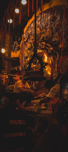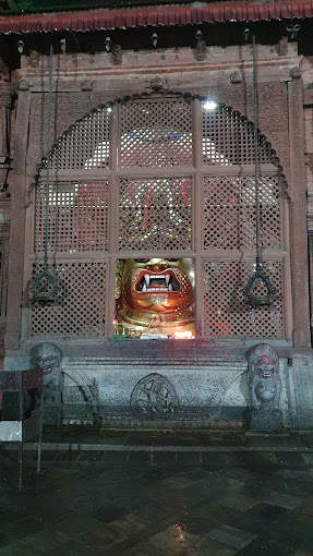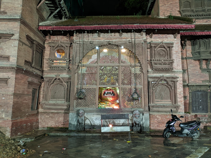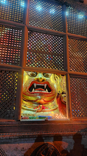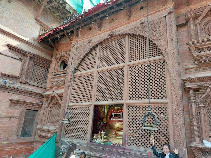Inside the wooden latticed screen, below Dega Taleju is hidden the terrifying face of Swet Bhairav. The giant sculpture was fashioned and installed in 1795, during the rule of Rana Bahadur Shah